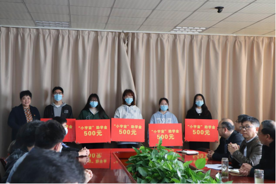 邵帅宣读了2021年度“小宇宙”助学金获得者名单。刘克平代表校友张献超、张会娟夫妇为获得“小宇宙”助学金同学颁发助学金。获奖学生发言,感谢校友的资助和学校的关爱,表示将在今后的学习和生活中继续克服困难,努力学习,以优异的成绩回报社会、回报母校、回报学长。