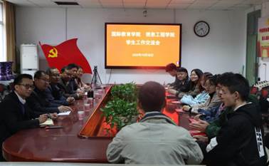 10月28日下午,国际教育学院与信息工程学院在0#502召开学生工作交流会。国际教育学院党总支书记张平,党总支副书记兼副院长吴艳兵,学生科科长兼团委书记李威,我院党委书记郎瑞红,党委副书记张建设,副处级党建组织员王明艳,以及担任国际教育学院2020级新生代理班主任的我院9名同学参加。会议由王明艳主持。