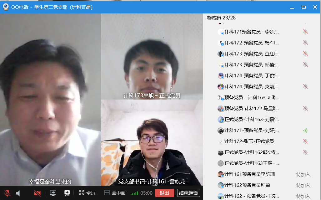 为更好开展疫情防控工作,提高认识,发挥支部战斗堡垒作用和党员先锋作用,2月28日-29日,信息工程学院党委组织所属党支部通过微信和QQ视频,开展“践行初心助战役 我为党旗添光彩”防控疫情主题党日活动。各支部组织全体党员学习了《习近平总书记2月23日在统筹推进新冠肺炎疫情防控和经济社会发展工作部署会议上的讲话》和校党委组织部《关于进一步发挥党组织和党员作用坚决打赢疫情防控阻击战的通知》、《关于组织全校党员自愿捐款支持疫情防控工作的通知》文件精神,并交流了防控疫情志愿活动和心得体会,组织党员开展了捐款活动。学院党委主要领导和党委委员以普通党员身份参加了主题党日活动,同时参加了联点党支部的主题党日活动。
