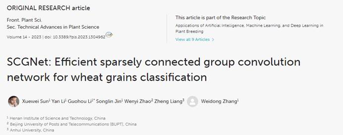 近日,信息工程学院研究生孙学伟等合作完成的研究论文“SCGNet: Efficientsparsely connected group convolution network for wheat grains classification”已发表在中科院2区Top期刊《Frontiers in Plant Science》。孙学伟同学为第一作者,我校为第一通讯单位。