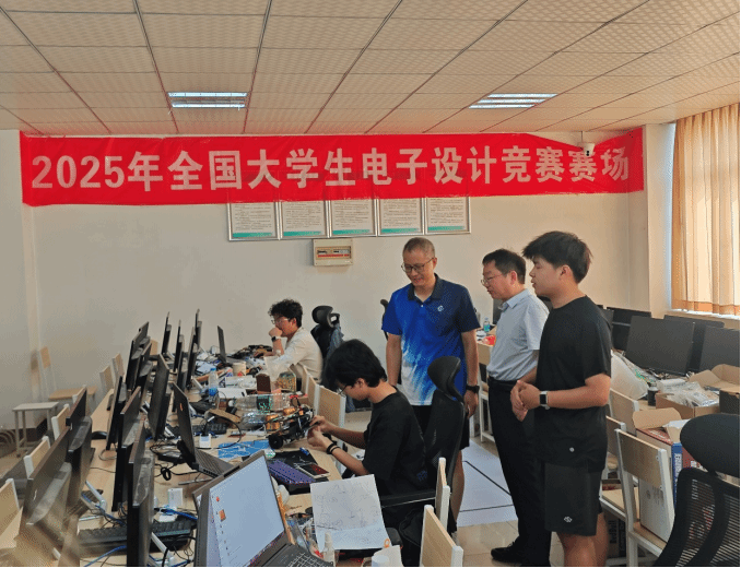 走进竞赛实验室,各参赛团队的同学们正全神贯注地投入设备调试与程序优化工作。示波器屏幕上跳动的波形、电路板上闪烁的指示灯显示出浓厚的竞赛氛围和精益求精的治学态度。杨宾峰逐一走到各参赛队的工作台前,驻足观摩学生们的操作过程,询问技术细节,详细了解大家的参赛状态与最新技术进展。