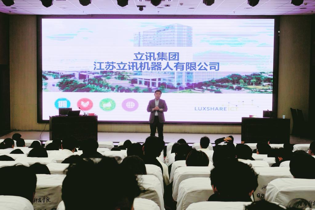 宣讲会上,主讲经理赵万纪从就业选择的关键要素切入,围绕就业形势和行业选择展开了细致讲解,从国家政策、区域优势、行业发展等多方面给出就业建议。在面向大四学生的招聘环节中,主讲人详细介绍了江苏立讯机器人有限公司的发展历程、企业文化以及岗位需求,展示出企业广阔的发展前景和对人才的高度重视。