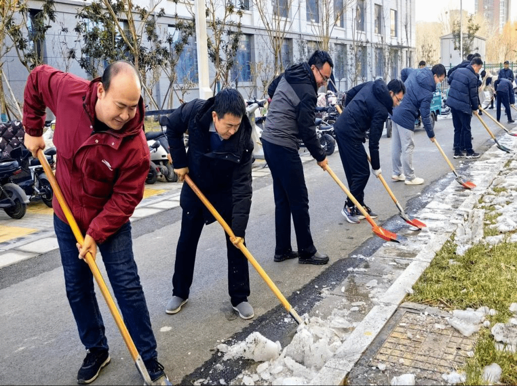 在除冰现场,党员志愿者不畏严寒,干劲十足,挥舞着铁锹,默契配合,一派热火朝天的景象,一个多小时就将原本被坚冰覆盖的道路清除干净,为师生开辟了一条洋溢着暖暖温情的安全之路。