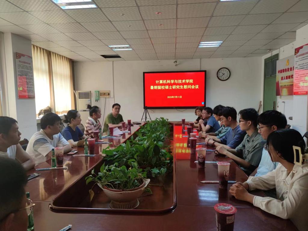7月11日上午,计算机科学与技术学院党委书记周启、院长高国红及研究生管理老师在0#502会议室对留校硕士研究生进行慰问,给学生们分发花露水、饮料、水果等慰问品,并进行座谈交流。