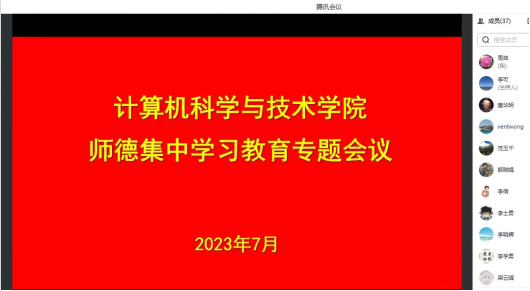 为进一步加强师德师风建设,7月18日晚上,计算机科学与技术学院在线上召开师德集中学习教育专题会议,学院党政班子与全体教工参加了此次会议。