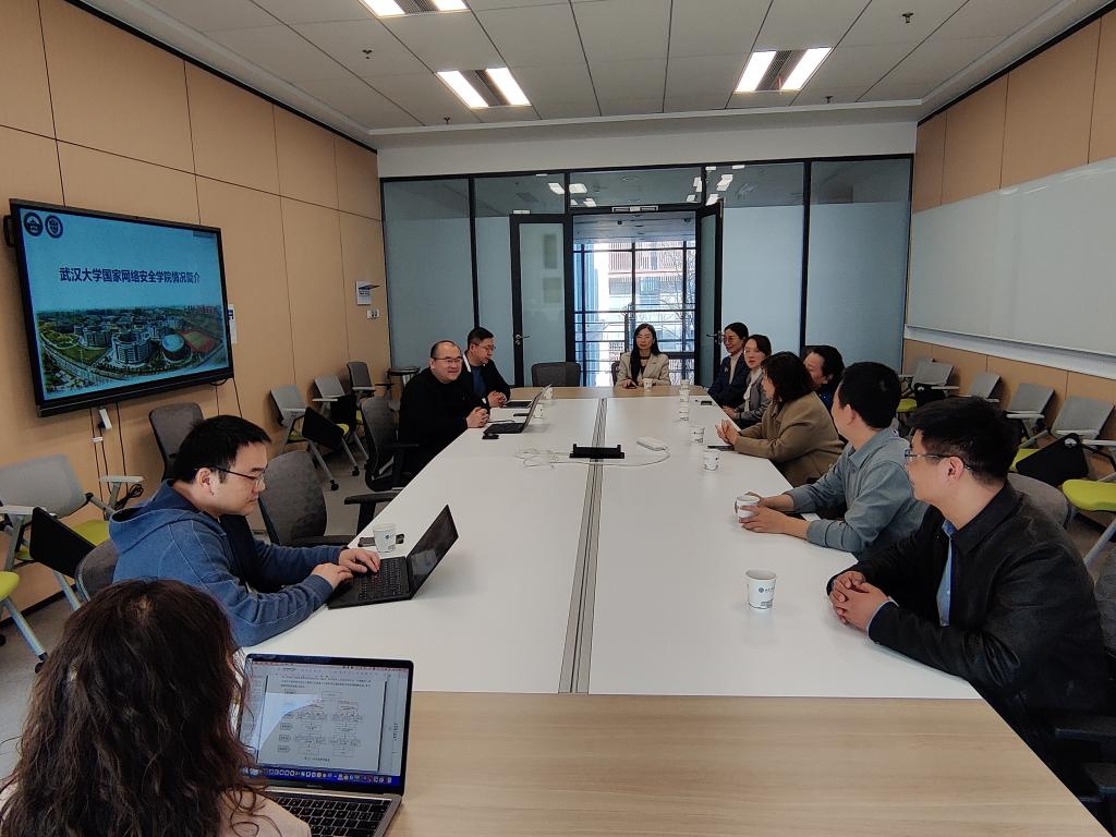 周启对武汉大学国家网络安全学院的接待表示感谢。王建平介绍了我院发展历程、人才队伍建设和学科布局以及今年刚获批的网络空间安全专业建设情况。武汉大学国家网络安全学院相关专业负责人就提出的专业建设问题进行了回答。双方就专业建设、联合实验室建设、人才引进和有组织的科研等方面进行了深入交流。