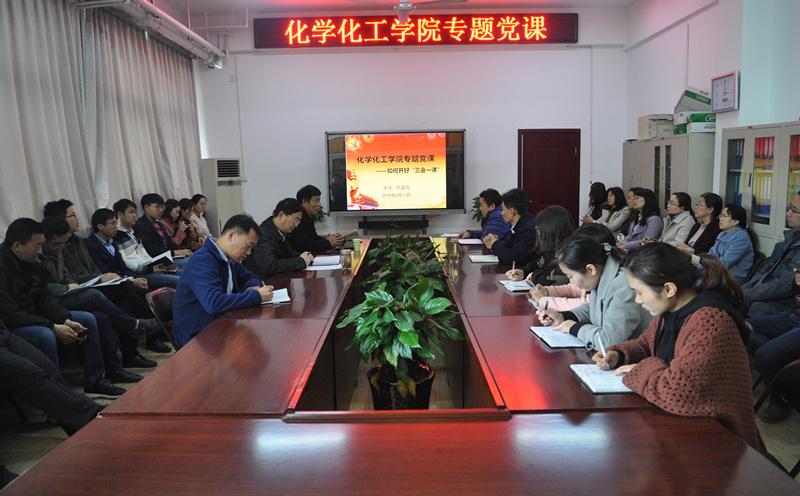 为深入学习贯彻《中国共产党支部工作条例》,切实做好基层党建工作,4月11日下午,化学化工学院党委邀请校党委组织部正处级组织员叶孟韬,为学院师生党员做《如何开好“三会一课”》专题党课。院党委委员、党支部书记、全体教师党员和学生党员代表参加了学习。党课学习会由院党委副书记朱宏主持。
