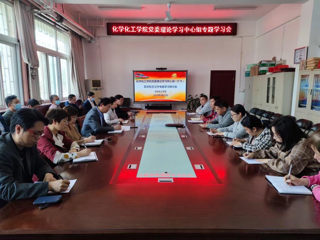 为扎实做好意识形态工作,切实维护学院安全稳定,4月21日下午,化学化工学院在学院会议室召开党委理论学习中心组(扩大)学习会,专题学习研讨意识形态工作。学院领导班子、各支部书记、科级干部、教研室主任、辅导员及无党派人士代表参加了会议,学习会由院党委书记赵亦芳主持。