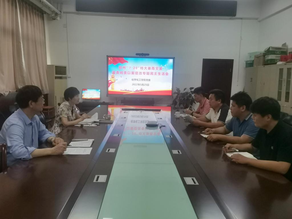 5月25日下午,化学化工学院在学院会议室召开郑州“7·20”特大暴雨灾害追责问责案件以案促改专题民主生活会,学院班子成员参加会议。会议由院党委书记赵亦芳主持。