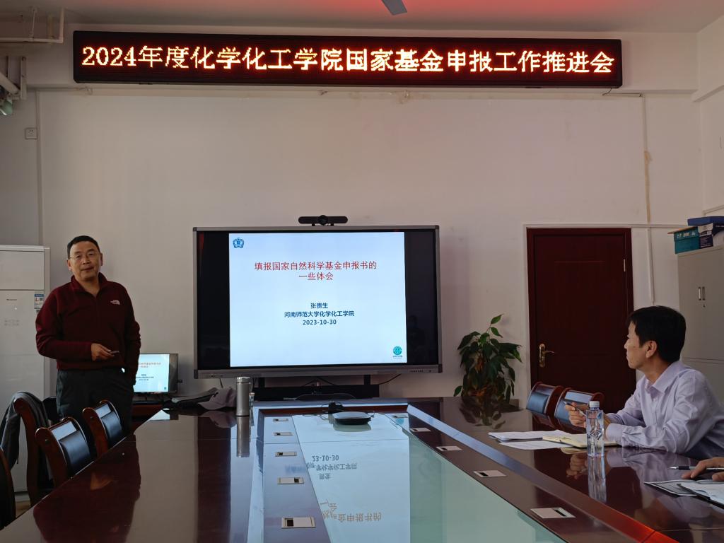 10月31日下午,河南师范大学化学化工学院二级教授、博士生导师、河南省特聘教授张贵生应邀到我院作了“国家基金项目申请的经验分享”学术报告。我院部分教授、博士及科研骨干聆听了报告,报告会由学院负责人主持。