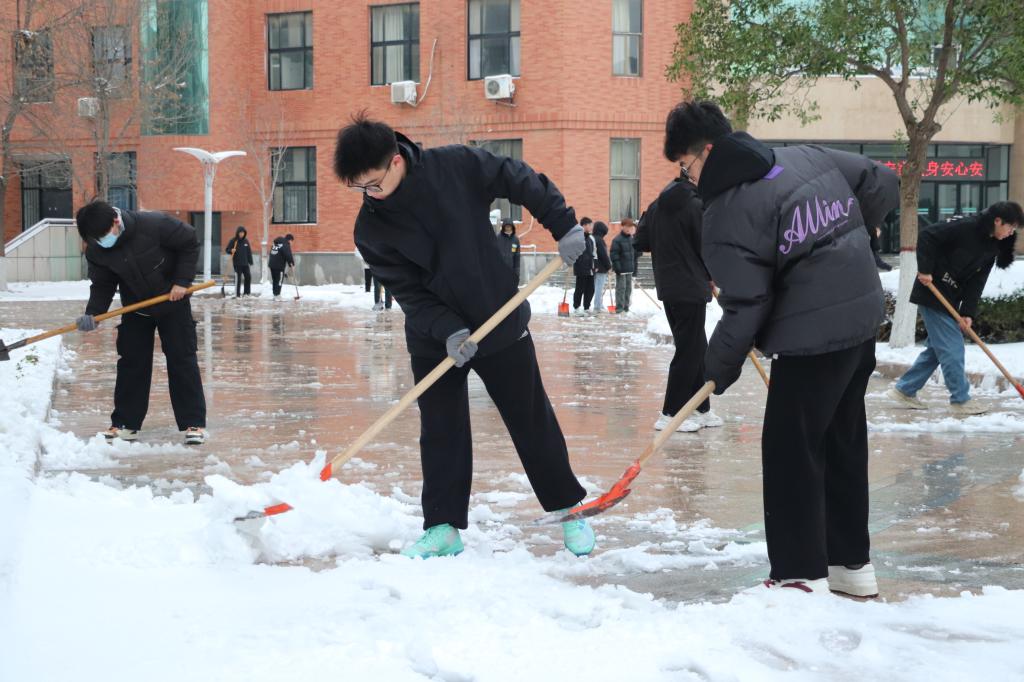 扫雪活动中,志愿者们带着铁锹、扫把等劳动工具,对校园道路的积雪、坚冰进行铲除。铲雪现场寒风凛冽、积雪厚重,大家齐心协力,分工合作,挥舞铁锹,铆足干劲,将全部精力投入到此次扫雪活动。劳动现场欢声笑语,志愿者们热情高涨,辛勤劳动的身影在校园内形成一道靓丽的风景线,充分发扬了吃苦耐劳的优良作风。经过不懈努力,学院楼前积雪被清理干净,道路变得畅通无阻,志愿者们用自己的劳动和热情为师生开辟了一条温暖的方便之路。