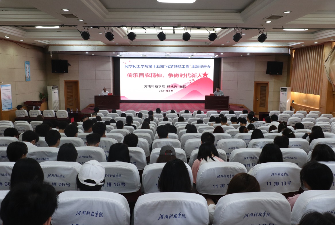 5月17日上午,化学化工学院在图教201报告厅举行“百农”精神暨第十五期“化梦领航工程”主题报告会。报告会邀请我校国家科技进步二等奖获得者杨永光教授主讲。学院领导班子、师生代表共计200余人参加了报告会。