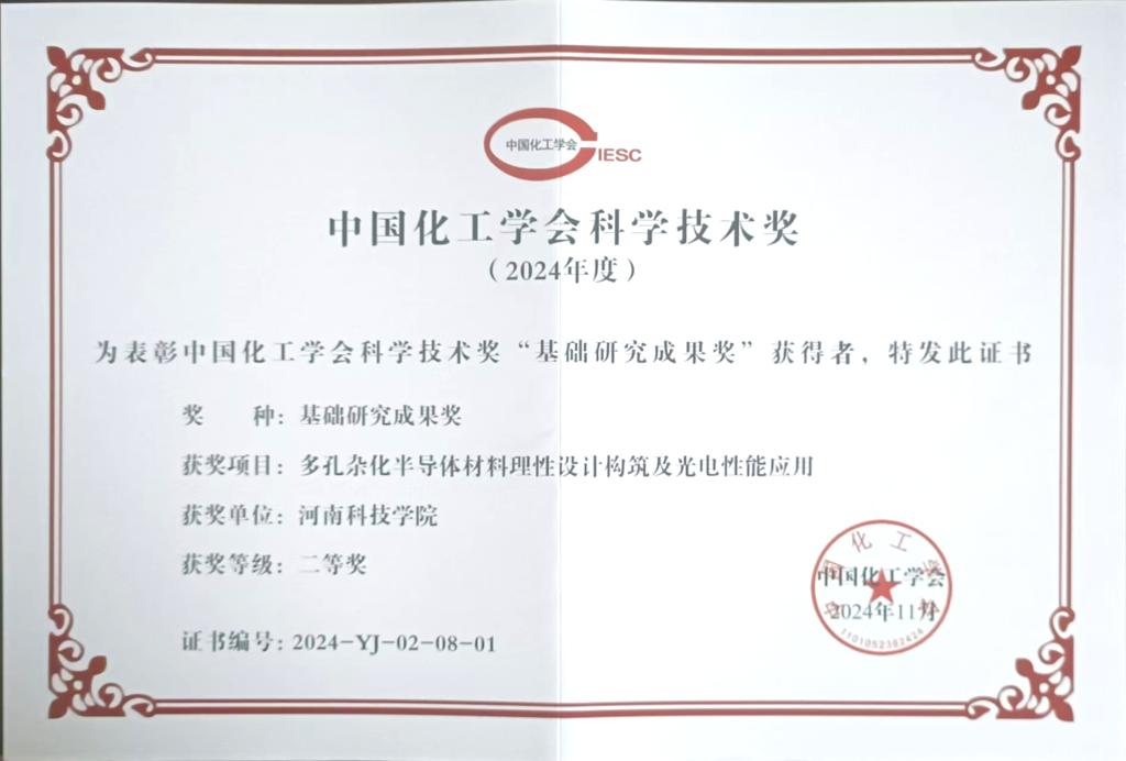 我校化学化工学院光电功能材料团队王吉超副教授以河南科技学院为第一完成单位申报的“多孔杂化半导体材料理性设计构筑及光电性能应用”获得中国化工学会科学技术奖---基础研究成果二等奖。该成果的获得实现了我校在中国化工学会科学技术奖的新突破,为我院下一步申报省级、国家级科学技术奖打下了坚实的基础。
