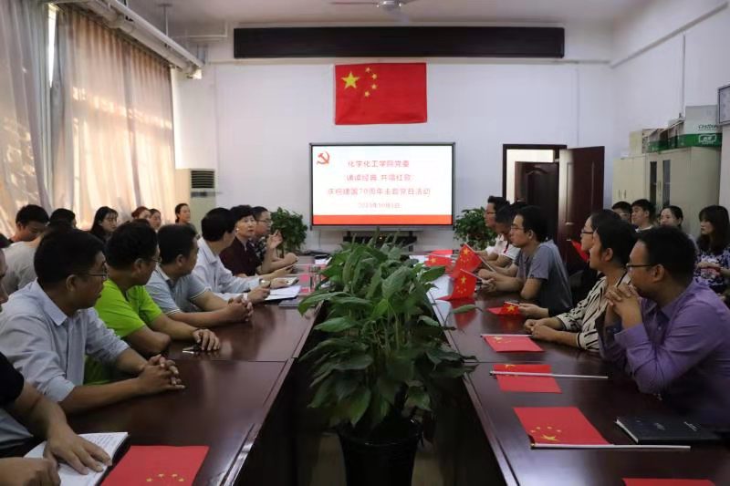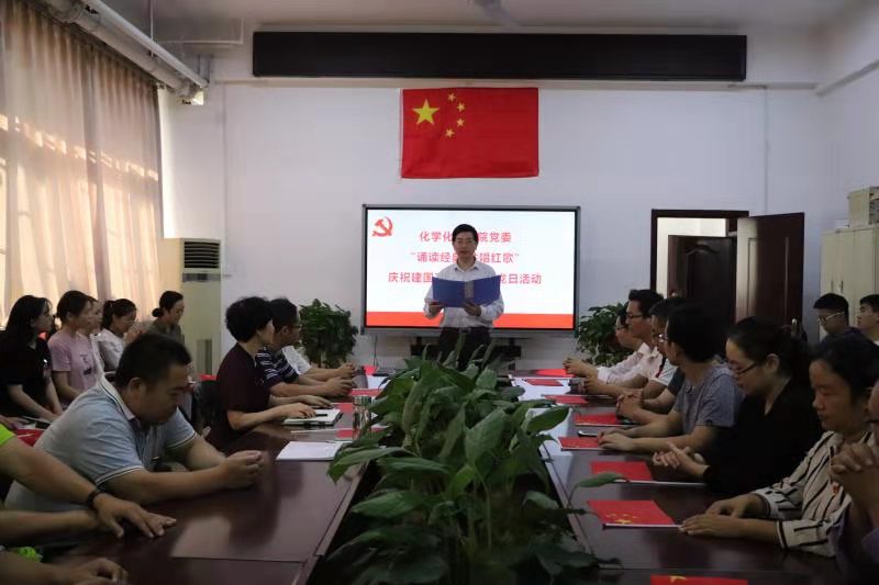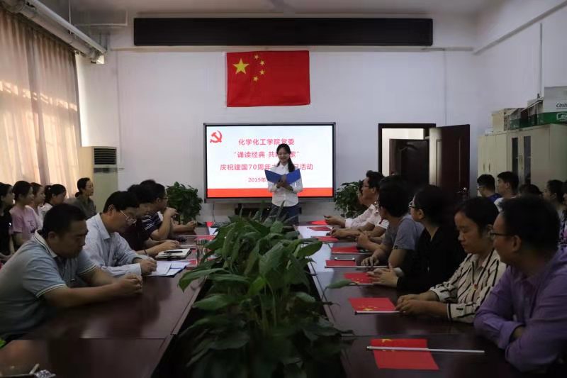为隆重庆祝新中国成立70周年,激发广大党员的爱国热情和干事创业的激情,10月1日上午9点,化学化工学院在学院会议室举行“诵读经典、共唱红歌”庆祝新中国成立70周年主题党日活动。院党委委员、支部书记和师生党员参加了主题党日活动。