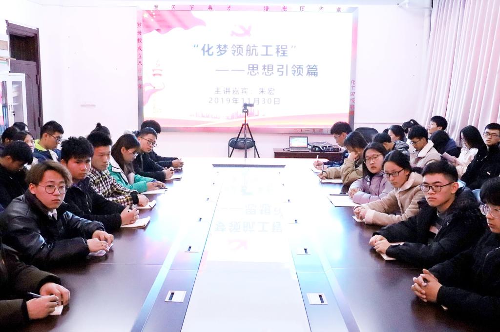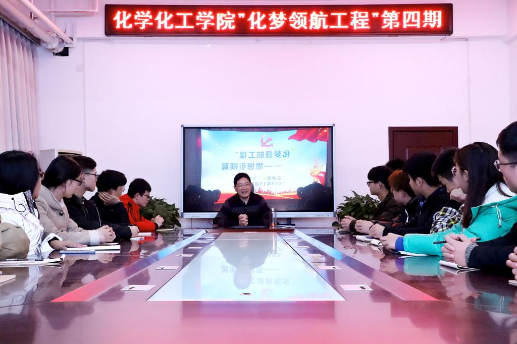 为加强思想政治教育,培养学生爱党爱国情怀,11月30日晚,化学化工学院在学院会议室举行“化梦领航工程”之思想引领篇师生交流会。学院60余名学生参加,院党委副书记朱宏担任主讲嘉宾。会议由院团委书记侯小鹏主持。
