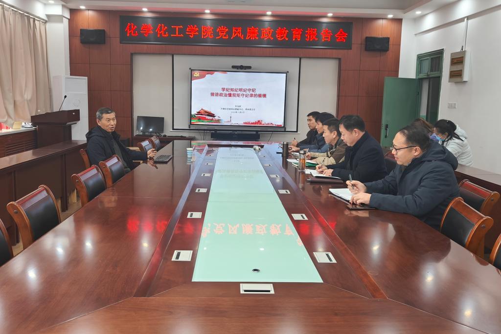 为深入推进党风廉政建设,加强党员廉洁自律意识,12月9日,化学化工学院举办党风廉政教育报告会。报告会邀请校纪委副书记、综合室主任张玉新作专题报告。学院领导班子、科级干部及全体党员参加报告会。会议由院党委书记孙震寰主持。