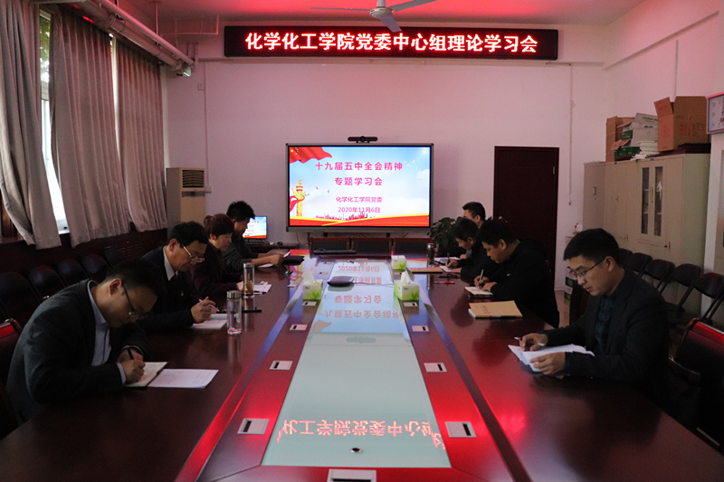 11月6日下午,化学化工学院党委理论学习中心组在学院会议室举行集中学习会,专题学习中国共产党第十九届中央委员会第五次全体会议精神。学院班子成员、科级干部参加了学习。学习会由院党委书记赵亦芳主持。