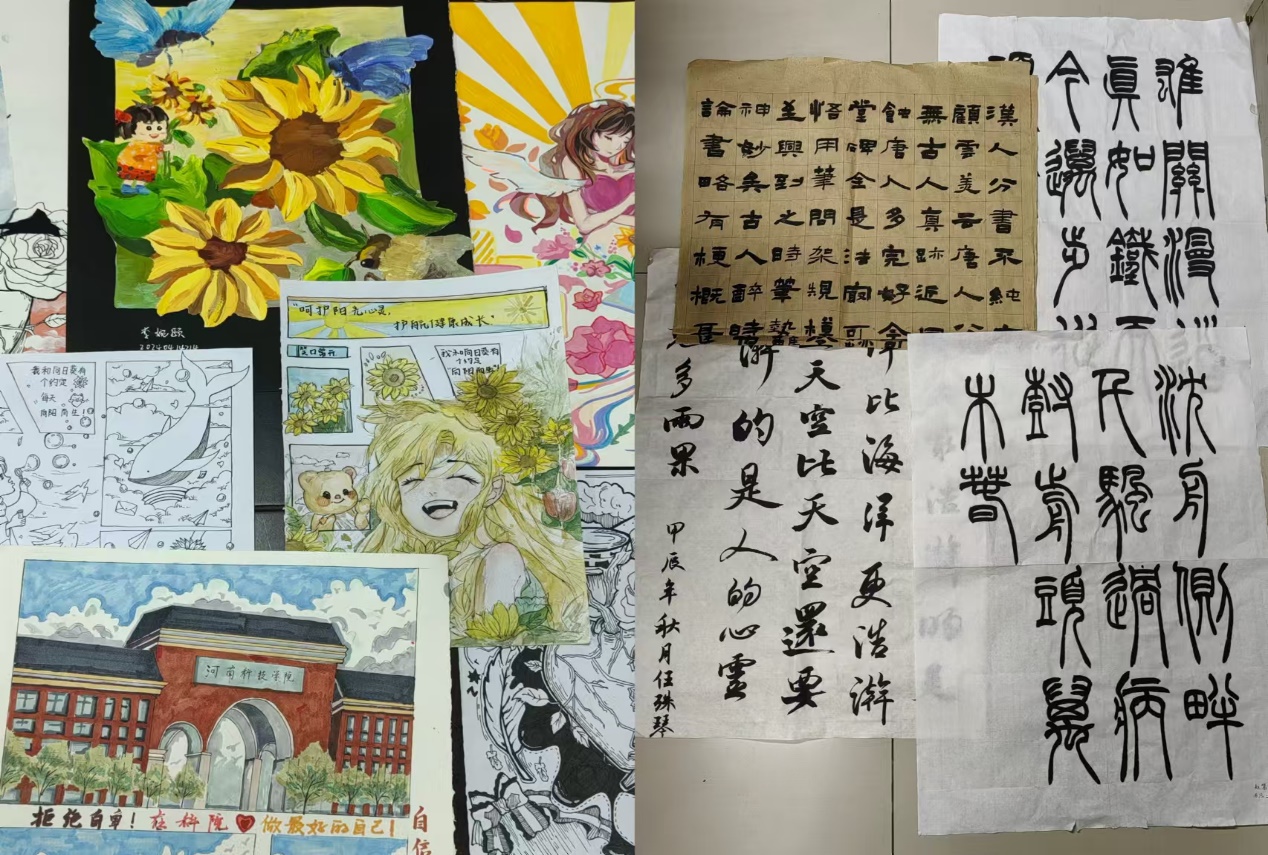 ——我院举办了心理健康书画、文创大赛,为心理健康增添色彩。同学们发挥专业特长,用画笔将热爱生活、青春飞扬的画面描绘在一幅幅书画和设计作品中,通过书画和设计传递积极向上的情感,促进心灵的美好交流。