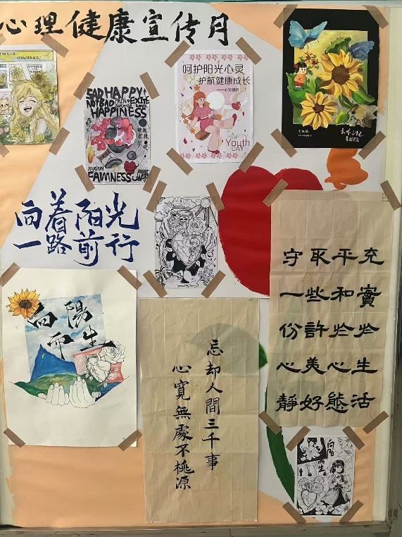 ——我院绘制了心理健康宣传月展板,用明艳的色彩画出守护心灵健康的元素,将书画、文创大赛的部分作品粘贴在展板上,传递了乐观心态和积极健康的心理理念。