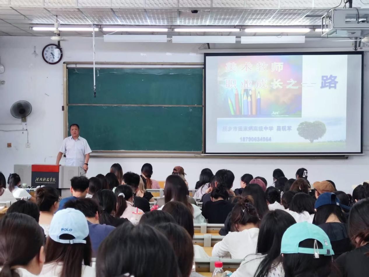 为提升师范生的专业理念与师德修养,发展美术专业知识和专业能力等综合素养,6月20下午,我院邀请新乡市田家炳中学吕砚军老师在1合一教室开展中学美术教育专题讲座,美术与设计学院副院长郑世华、副院长田伟、国画教研室主任郝好燕及美术学专业150余人共同聆听了讲座。