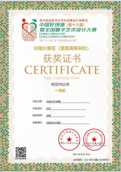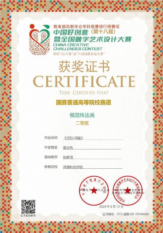 近日获悉,在第十八届中国好创意暨全国数字艺术设计大赛中,我院学生参赛作品获奖4项。其中设计硕士研究生裴志伟的作品《记忆·河南》荣获国赛二等奖;工艺美术专业本科生张可颖、杨梦依的作品《钟·遇》荣获国赛二等奖;动画专业本科生刘洋的动态海报作品《中国古代神兽》荣获河南分赛区一等奖;产品设计专业本科生范雅洁、刘景怡、袁扶林的作品《谷咔轻食品牌IP形象设计》荣获河南分赛区三等奖。