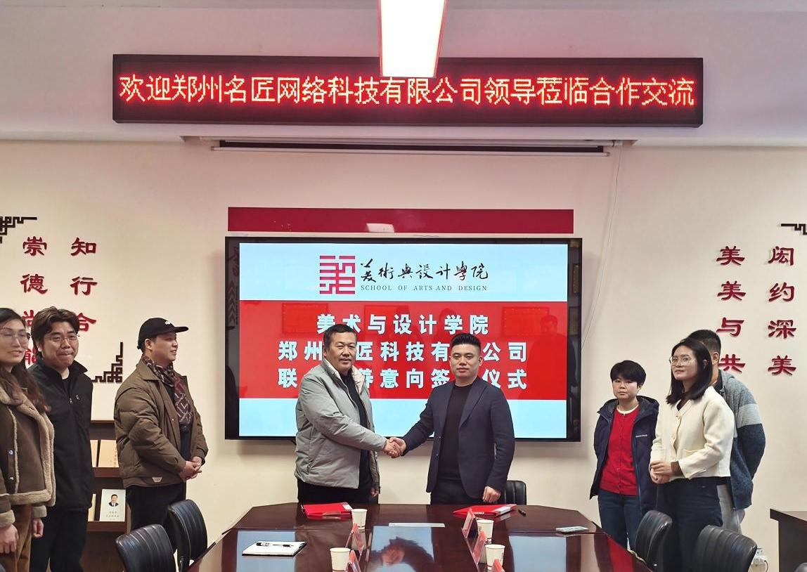 3月6日,我院与郑州名匠网络科技有限公司举行战略合作意向协议签约仪式在11#208会议室举行。院长雷保杰、郑州名匠网络科技有限公司负责人原旭普分别代表双方签署联合培养合作意向协议,副院长胡国锋、相关动画专业教师代表、合作企业项目负责人参加签约仪式。