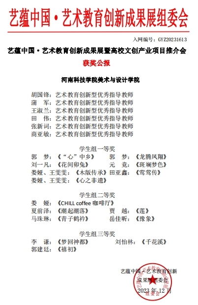 近日,我院研究生参加了首届“艺蕴中国·全国艺术教育创新成果展暨全国高校文创产业项目推介会”的作品征集比赛,在本次比赛中,我院师生获得了一等奖7项、二等奖5项、三等奖3项的优异成绩。同时,我院多名硕士生导师获得艺术创新教育优秀指导教师荣誉称号。