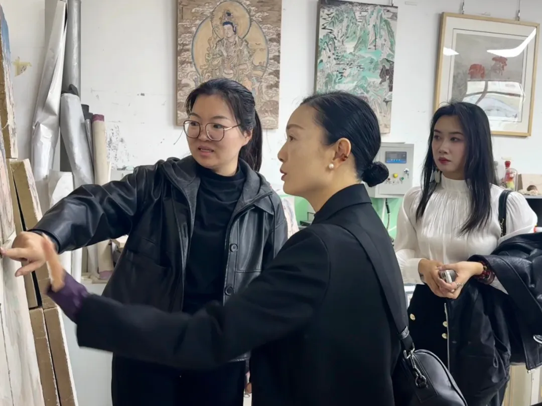 交流学习期间,敦煌学院王晓波、许秀玲、扎雅娜等教师陪同姬英涛一行参观了美术馆、扎染工作室和舞蹈排练厅,全方位感受敦煌艺术魅力与教学成果。美术馆内,王晓波详细讲解了敦煌壁画临摹、现代艺术创作及学生实践成果。扎染工作室里,许秀玲引导大家领略敦煌色彩与民间工艺的巧妙结合。在5楼舞蹈排练厅,扎雅娜邀请大家观摩敦煌舞课堂教学,同学们现场展示的经典的“反弹琵琶”“飞天伎乐”等舞姿舞段,婉转的韵律和深厚的文化底蕴赢得现场师生的阵阵掌声。