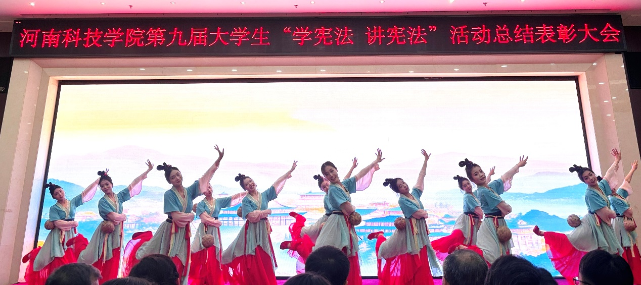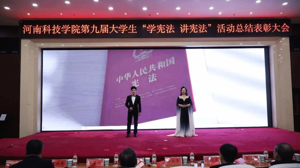 新乡市委依法治市委员会守法普法协调小组办公室副主任、市司法局党委委员、政治部主任李爱萍,校党委副书记王庆兵,副校长王洪亮出席大会,校依法治校工作领导小组成员单位负责人及200余名师生代表参加大会。我院师生受邀参演本次活动。