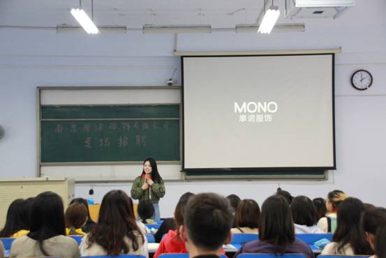 10月19日中午13:00,南京摩诺服饰有限公司在4号楼合四教室召开实习招聘专场宣讲会,我院100余名2019级毕业生参加了宣讲会。
