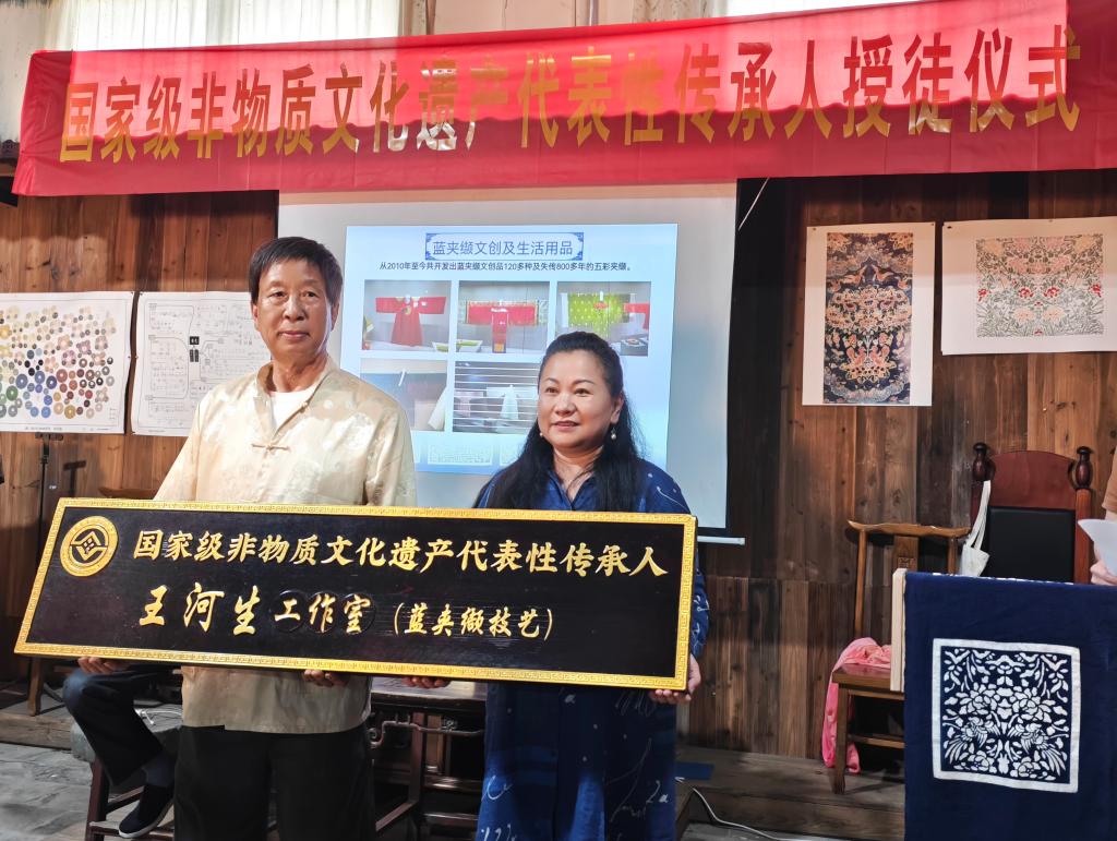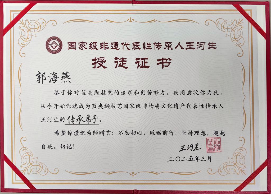 4月20日,蓝夹缬技艺国家级非遗代表性传承人王河生召开收徒仪式,服装学院教师郭海燕作为唯一的传承弟子参加了仪式。