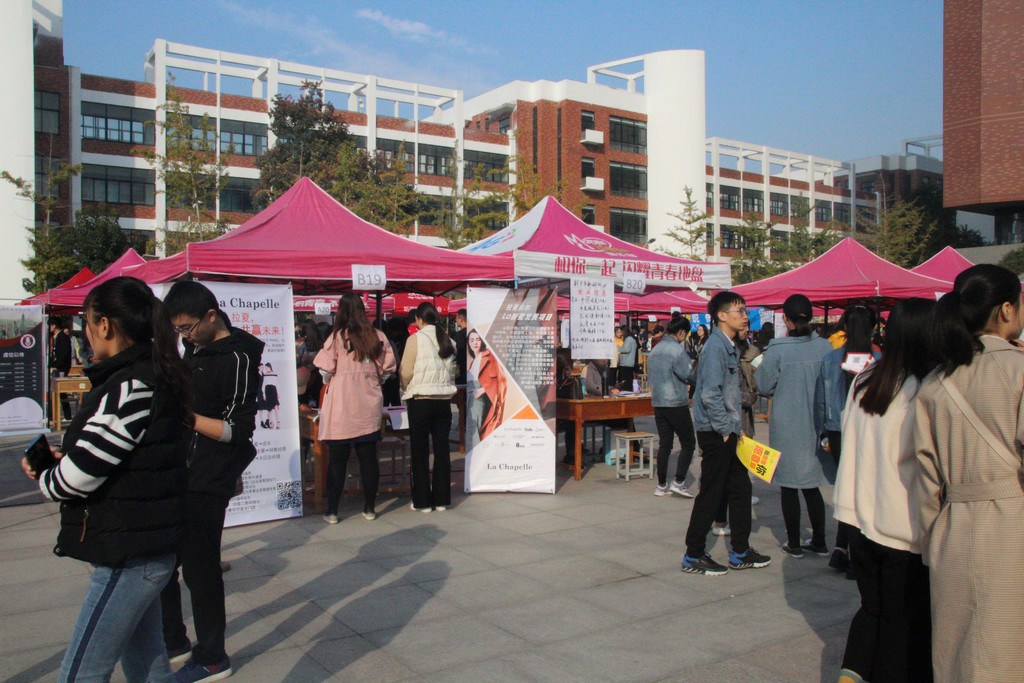 11月3日上午,服装学院与体育、文法、教科、艺术、数学、外语等学院在新图书馆前启智广场举办2019届毕业生就业双向选择洽谈会。