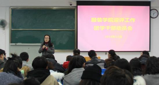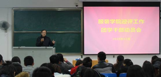 12月5日17:50,服装学院在八合三教室举行迎评工作团学干部动员会。服装学院党委书记张平、党委副书记王琳、团委书记董华明、团委副书记梁瑞、辅导员张小雪、团委学生会干部及团支书、班长、学习委员等一百余人参加,团委书记董华明主持动员会。