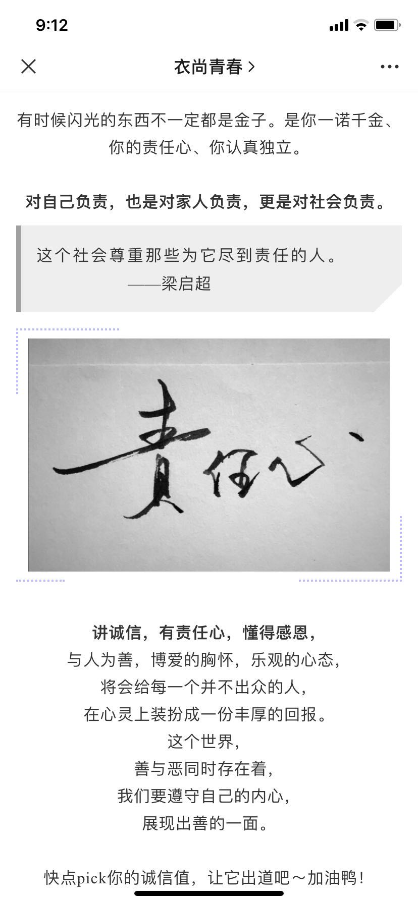与此同时,“树立诚信观念 防范金融风险”主题微信文案比赛也在进行。文案比赛旨在通过新媒体渠道引导广大青年学生珍爱信用、理性借贷、不负信任,以提高学生征信意识、金融意识、风险意识、法律意识,增强当代大学生的责任感,帮助他们树立正确的消费观、荣辱观、价值观。文案比赛共收到18篇作品,学院评比选取1篇优秀作品,发布在服装学院学院微信公众号上,并报送学校参加评选。