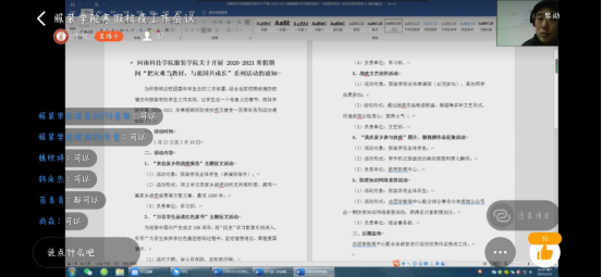为更好的落实校团委、学生处做好寒假期间学生工作的部署,服装学院团委结合当前疫情防控情况和学院学生工作实际,1月23日,召开寒假线上学生工作会议,服装学院全体学生干部参加了会议。团委副书记李牧主持会议。
