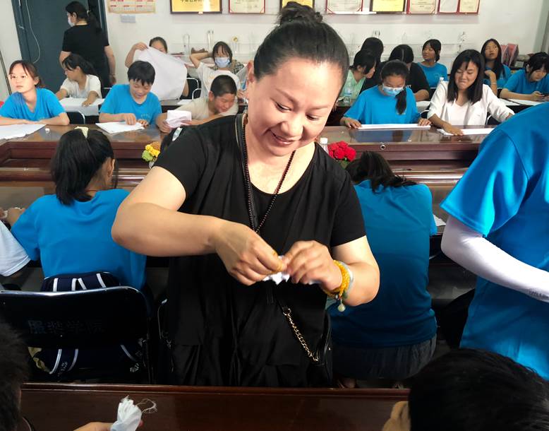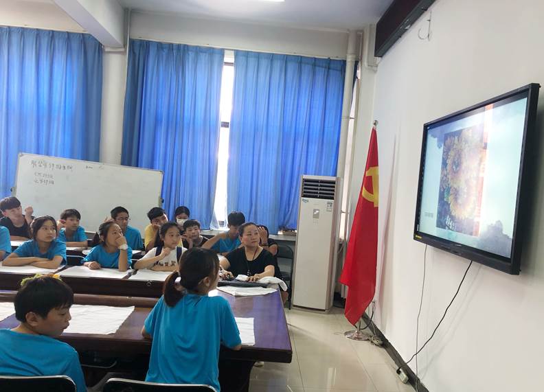 在学院二楼会议室,郭海燕老师以扎染艺术设计为题,为孩子们讲解了扎染艺术起源、扎染定义、扎染分类、生活中的扎染,提升学生对服饰扎染作品的审美能力。随后,在老师的指导下,孩子们进行了捆扎面料、浸水备染、染色设计实践操作。当孩子们亲手打开自己五彩斑斓的扎染作品时,都露出了欣喜的笑容。