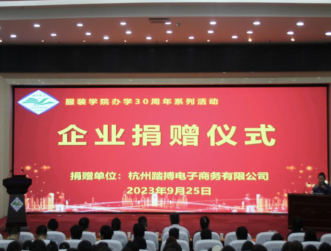 9月25日下午,服装学院在行政楼308报告厅举行办学30周年企业捐赠仪式暨校友励志报告会。学院党委书记游红伟、院长商亚敏、副院长郭海燕,杭州踏搏电子商务有限公司相关负责人、学院优秀校友甘兆右及学院300余名师生参加,捐赠仪式由郭海燕主持。