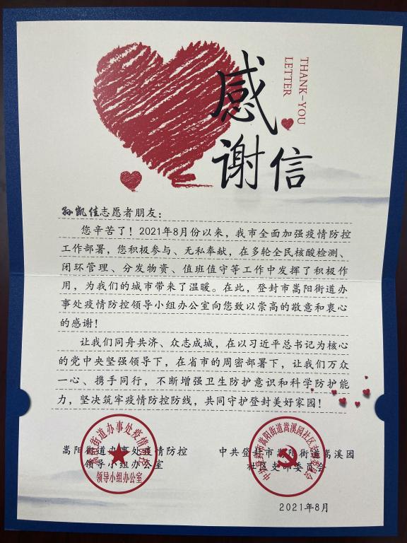 日前我院收到一封来自嵩阳街道办事处疫情防控领导小组办公室、中共登封市嵩阳街道嵩溪园社区支部委员会的感谢信。自8月以来,河南省全面加强疫情防控工作部署,家在登封的我院服装202班孙凯佳同学积极参与家乡疫情防控工作,在多轮全民核酸检测、闭环管理、分发物资、值班值守等工作中发挥了积极作用,用实际行动展现了当代大学生良好的精神风貌。