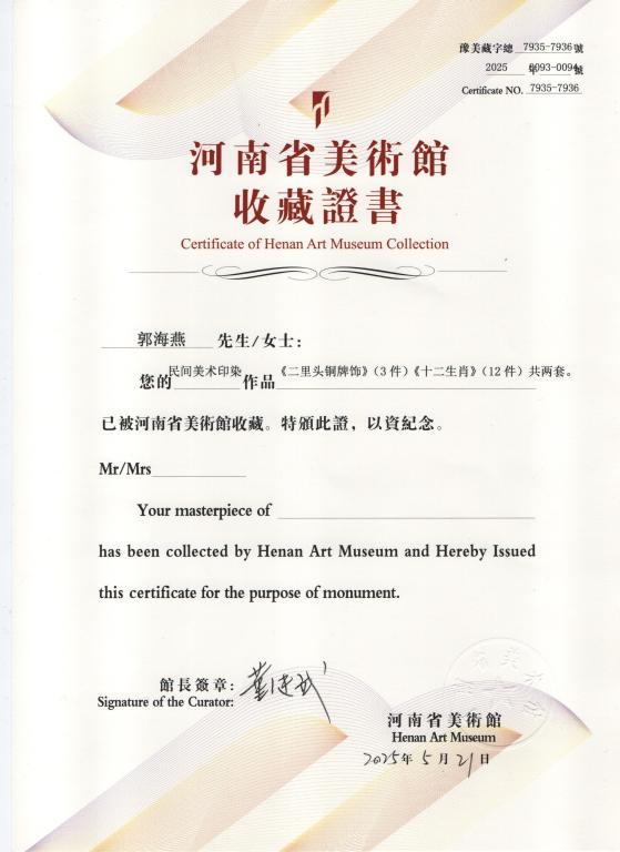 近日,我院郭海燕副教授的15件染缬艺术作品《二里头铜牌饰》《十二生肖》,正式被河南省美术馆收藏。