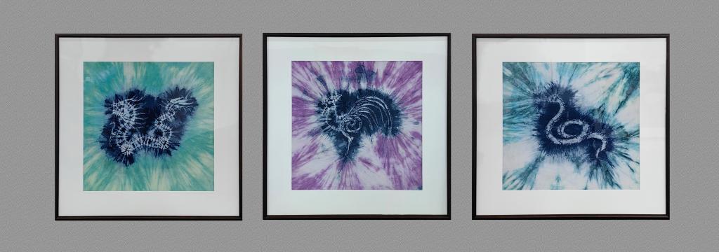 《二里头铜牌饰》及《十二生肖》是郭海燕具有代表性的原创作品。二里头文化是中国青铜时代的早期文化,亦是华夏文明的主流。将染缬艺术与二里头铜牌饰的文化元素相结合,使二里头文化以新的形式得到传播和弘扬;十二生肖是中国民俗文化的核心符号,染缬艺术将十二生肖的图案转化为可触摸的织物艺术,让非遗技艺在当代生活中找到落脚点,实现“传统工艺活化”与“民俗文化再生”的双重价值。在创作手法上,郭海燕巧妙融合了扎染、蜡绘染及创意染等手法,通过细腻的针法及大胆的笔触,丰富的色彩运用,构建出极具视觉冲击力的画面。