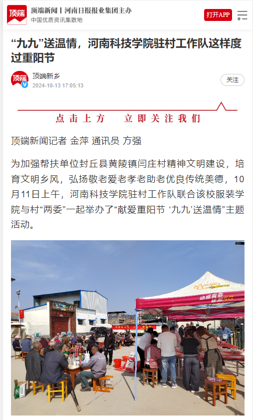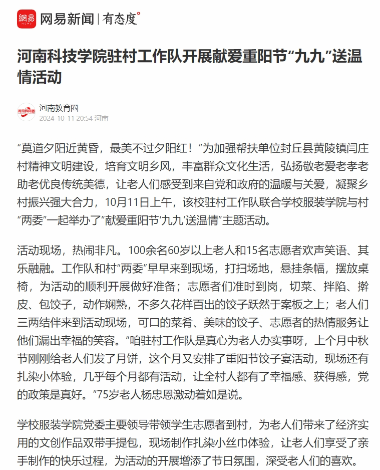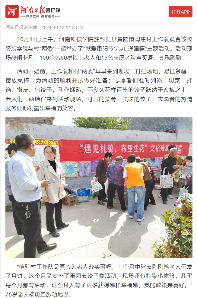 9月9日上午,服装学院联合我校驻村工作队与村“两委”一起举办“献爱重阳节‘九九’送温情主题活动。活动现场师生们与村民一起包饺子、体验手工扎染,同时为村民送上精美文创产品帆布包。此次活动受到《河南日报》、《网易新闻》、《顶端新闻》等媒体平台报道。