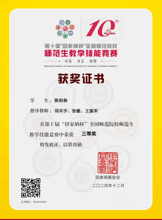 近日,第十届“田家炳杯”全国师范院校师范生教学技能竞赛结果揭晓,我院2022级学生陈柏杨荣获汉语言文学组三等奖。