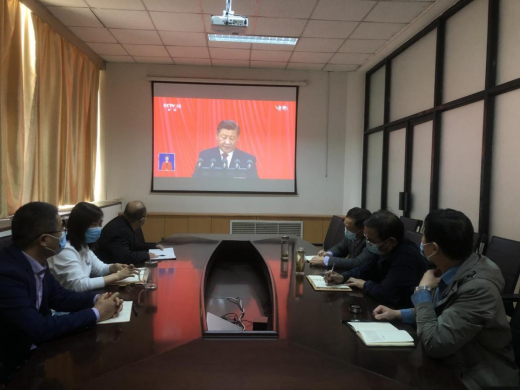 文法学院党委理论中心组成员在学院二楼会议室集中收看大会开幕会直播。此外,学院还组织师生采用集中和分散的形式收看大会开幕会直播。