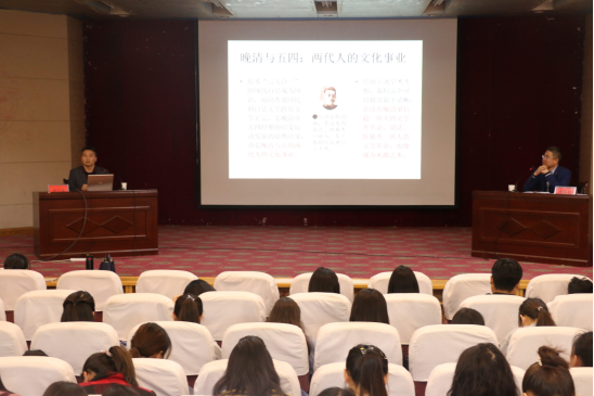3月18日下午,河南大学博士生导师胡全章教授应邀在我校图教201作题为《晚清与五四:从改良文言到改良白话》的主题讲座,讲座由文法学院副院长张东旭主持,文学学院中文系师生代表聆听了讲座。
