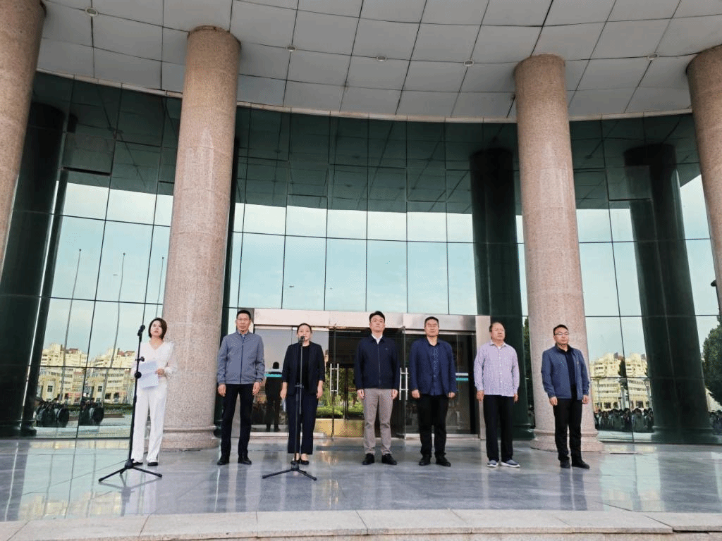 清晨,天际初露曙光,国旗护卫队以无比庄严的步伐,护送五星红旗至升旗台。随着国歌响起,全体师生神情肃穆,面向缓缓升起的国旗行注目礼,以心灵之声共同吟唱国歌。