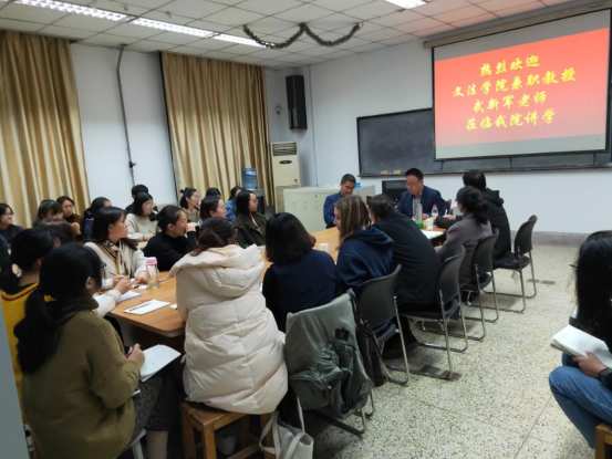 11月7日——11月8日,河南大学博士生导师、河南科技学院文法学院兼职教授武新军老师,在文法学院五楼研究生教室为我院教师和研究生做关于“文学研究的方法”的专题讲座。讲座由文法学院副院长张东旭主持,文法学院院长周全星,张敏、苏喜庆等教师代表和全体研究生参加了讲座。