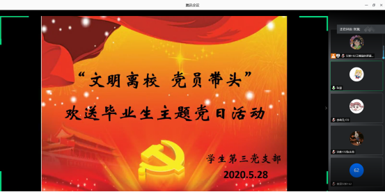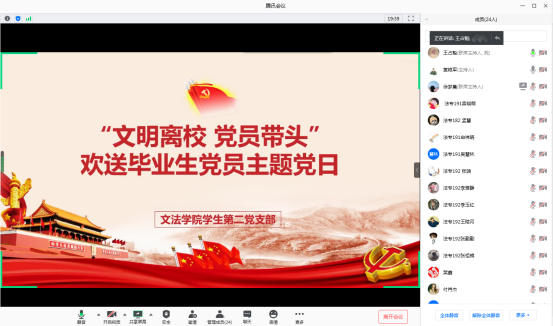 党员先锋,责任牢记心间。发展一名党员,树立一面旗帜。文法学院学生党支部分别开展“文明离校,党员带头”欢送毕业生主题党日活动,要求毕业生党员严格执行疫情防控纪律和返校要求,在保护好自己的同时,关心同学、服务同学,确保毕业生安全、文明、高效、有序完成返校暨离校的各项工作,并希望所有毕业生党员做好表率作用,站好最后一班岗,积极发挥学生党员的先锋模范作用,在实践中践行一名党员的初心和使命。
