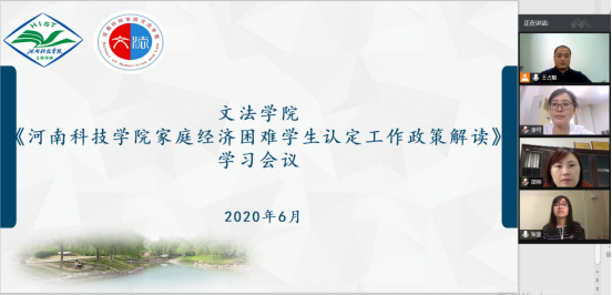 为认真做好我院家庭经济困难学生认定工作,6月17日,文法学院在腾讯会议召开《河南科技学院家庭经济困难学生认定工作政策解读》学习会议。文法学院党委副书记邵帅,辅导员李可、王占魁、张慧参加会议。会议由我院资助专管员王占魁老师主持。