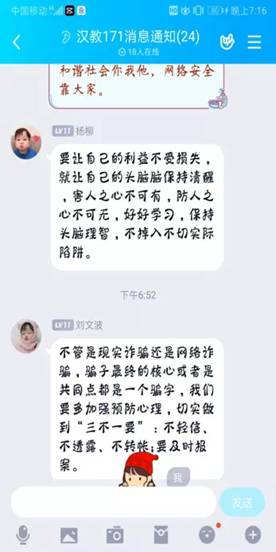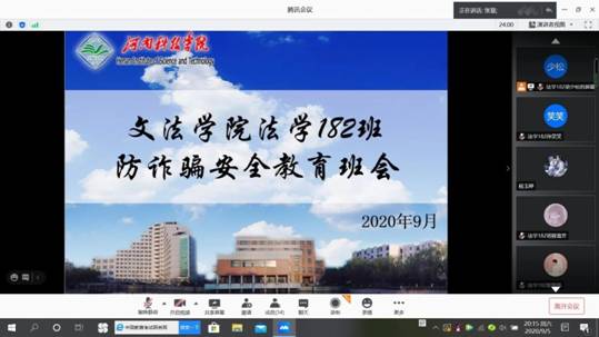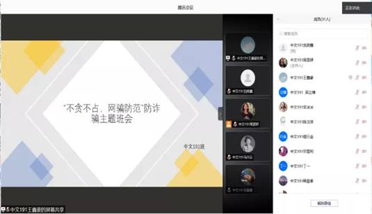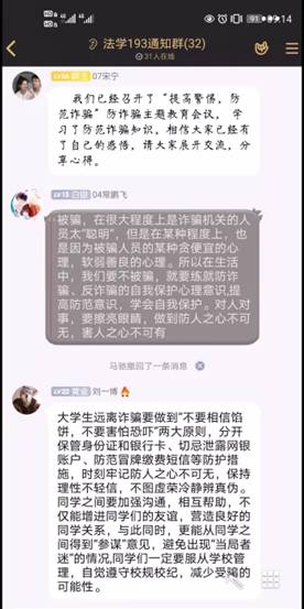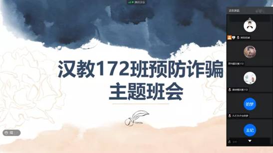 各班依靠微信、QQ、腾讯会议等网络平台开展防范电信诈骗线上主题班会,组织学生观看防电信网络诈骗短视频,学习有关预防电信网络诈骗的方法和电信网络诈骗手段,帮助同学们进一步增强防电信诈骗能力。