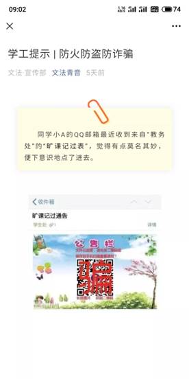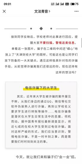 我院通过微信公众号“文法青音”推送相关文章,针对当前电信诈骗所面临的形势、突出的特点以及如何防范等内容,结合典型案例提出防电信网络诈骗七招,为同学们排忧解难。